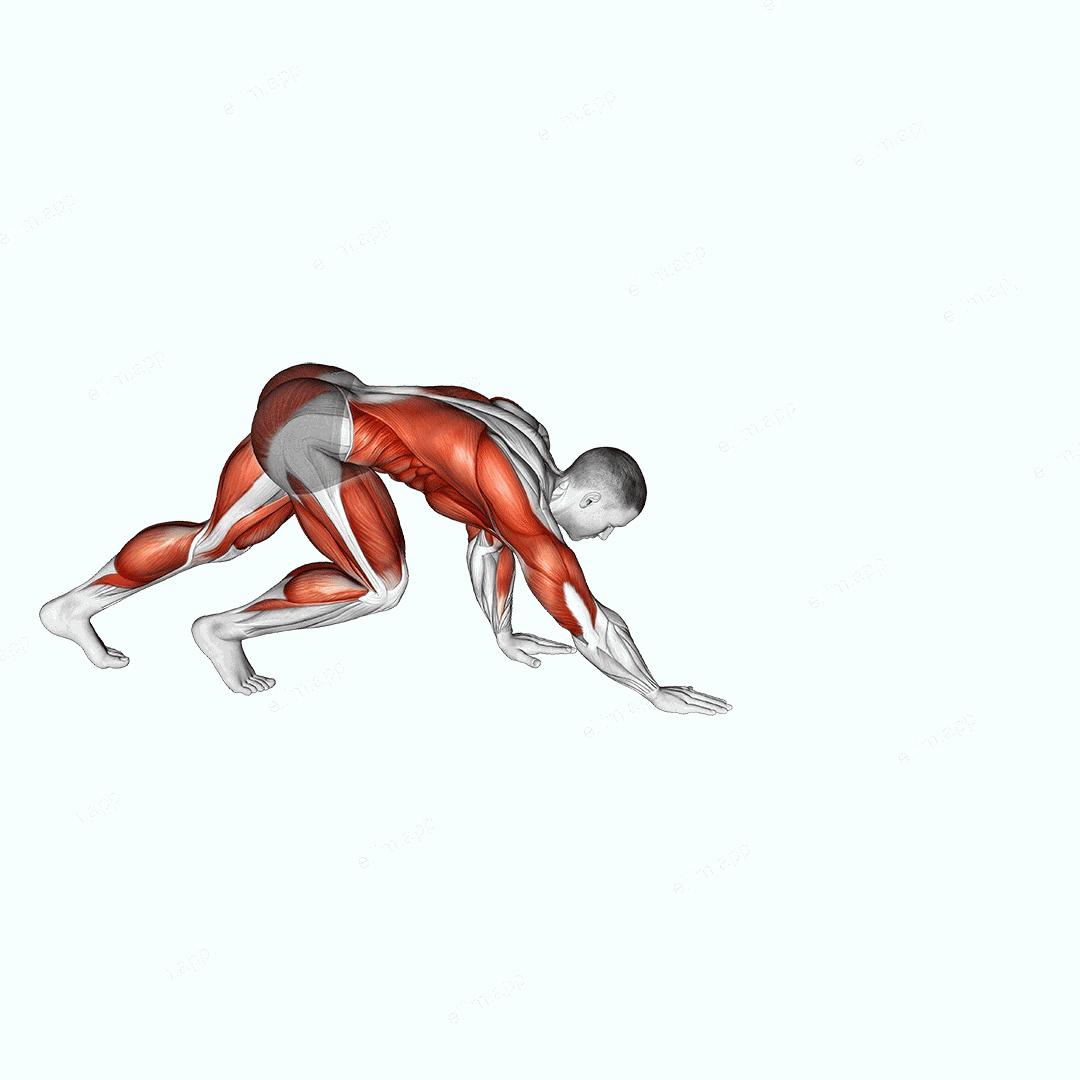 The Bear Crawl exercise is a full body workout that engages all the major muscle groups. The exerciser uses their hands and feet to crawl forward or backward across the floor.