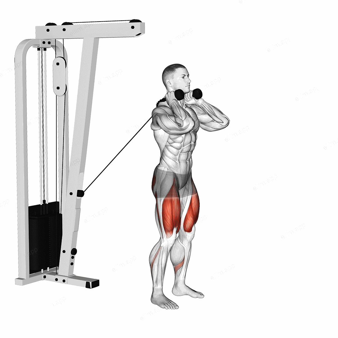 A full-body exercise that targets the glutes, quads and hamstrings. The cable adds additional resistance to the movement, increasing the difficulty and muscle engagement.