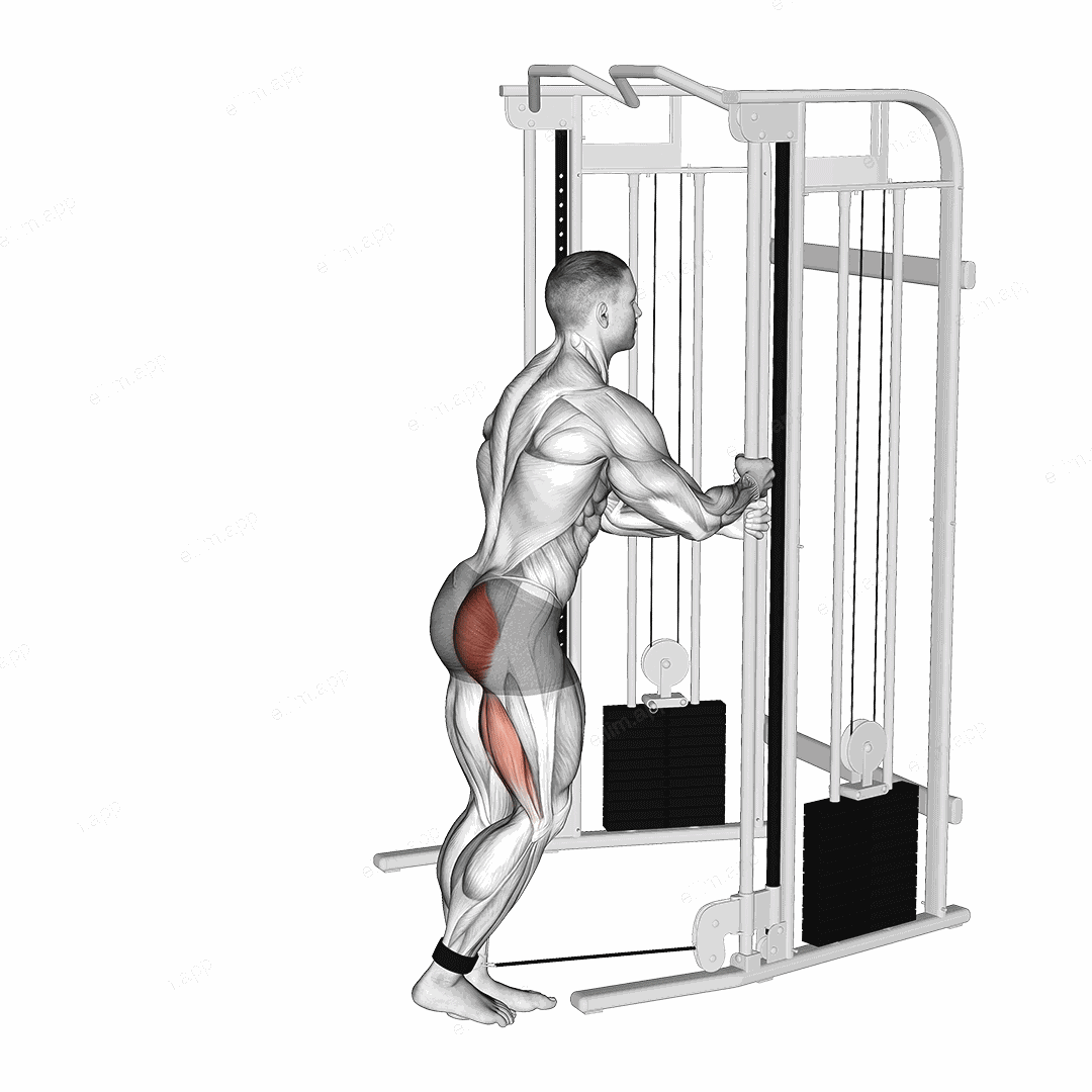 Cable Kickback is a strength training exercise targeting the gluteus muscles. The exerciser uses a cable machine to push back with one leg, keeping the knee slightly bent.