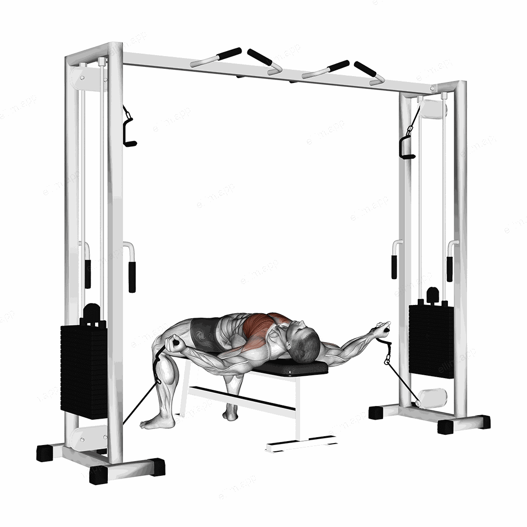 A strength training exercise where the individual lies on a flat bench, holding a cable in each hand, and then moves their arms out to the sides and back in a 'fly' motion.