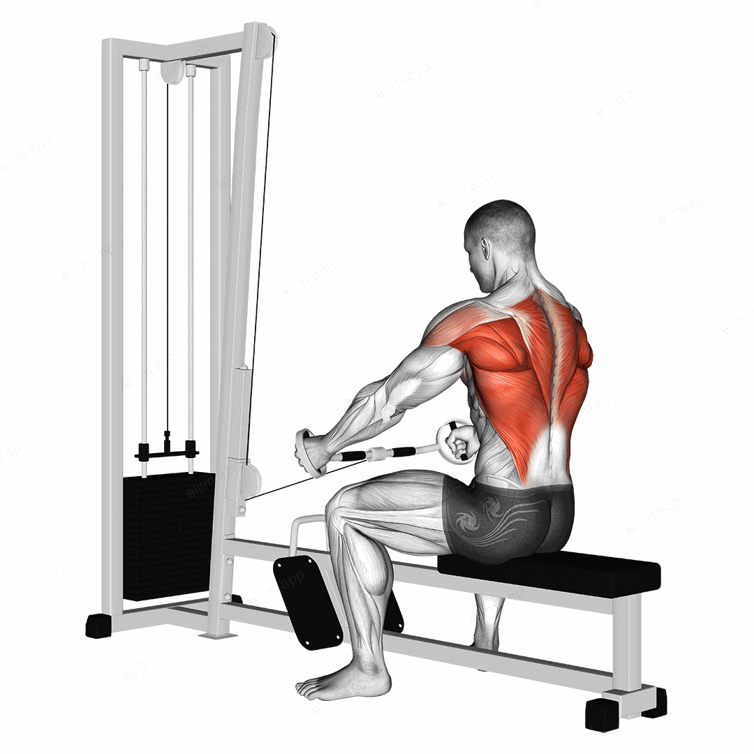 A strength exercise that targets the back muscles. The user pulls a weighted bent bar towards their torso while seated.