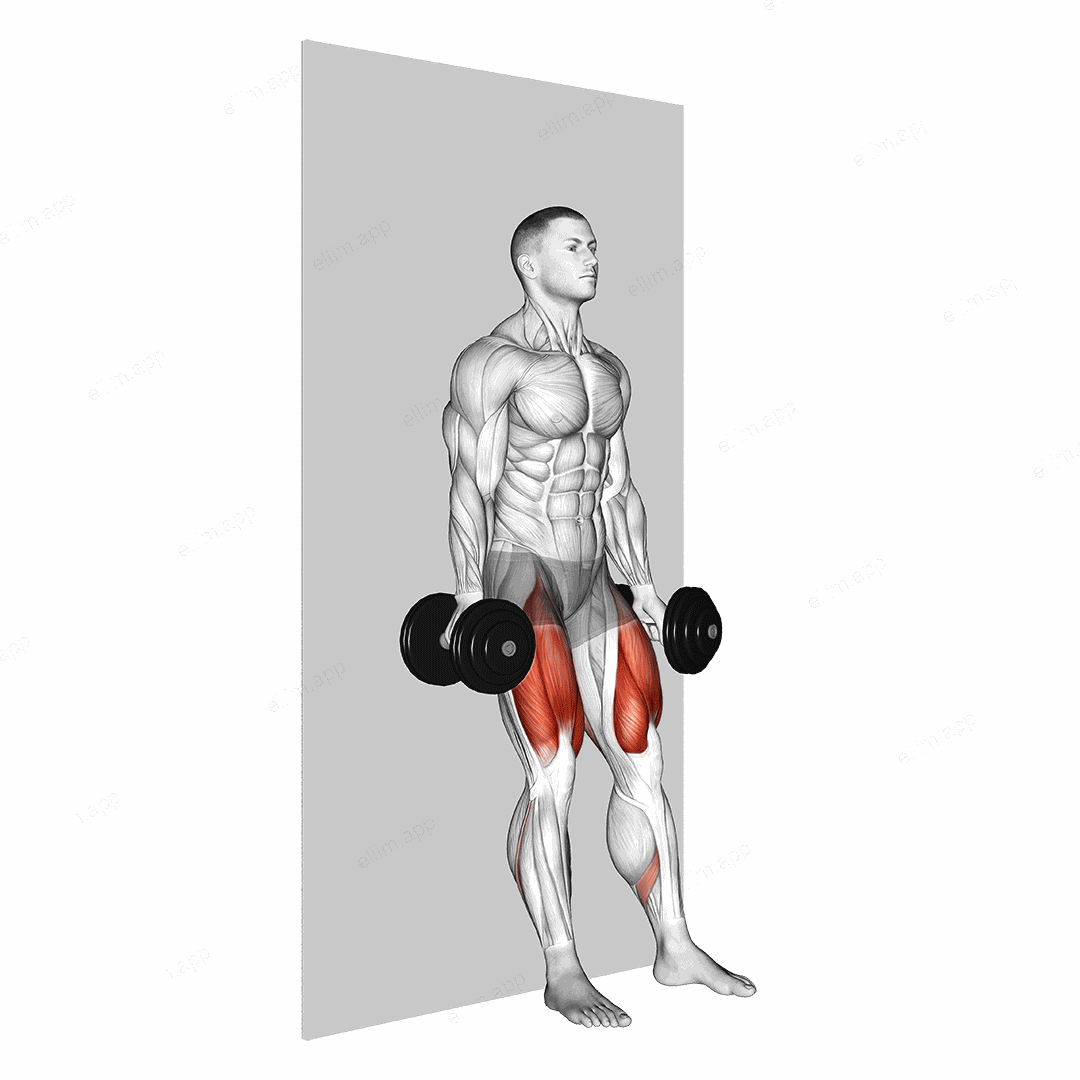 A lower body exercise that targets quadriceps, but also works the glutes and hamstrings. The user stands with their back against a wall, holding a dumbbell in each hand, then squats down and rises again.