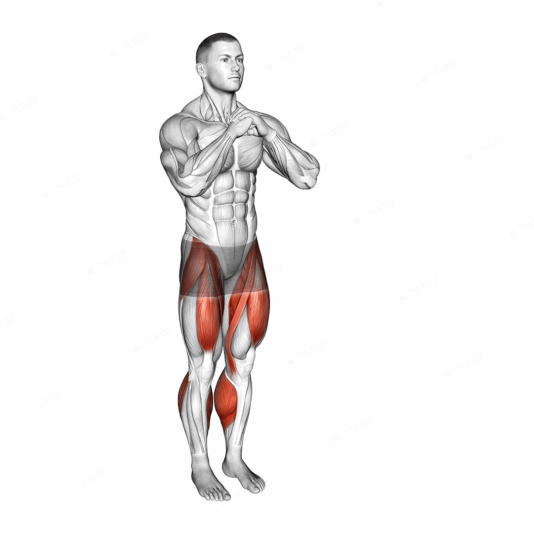 Stand tall with your feet hip-width apart and your arms relaxed at your sides or extended forward for balance.