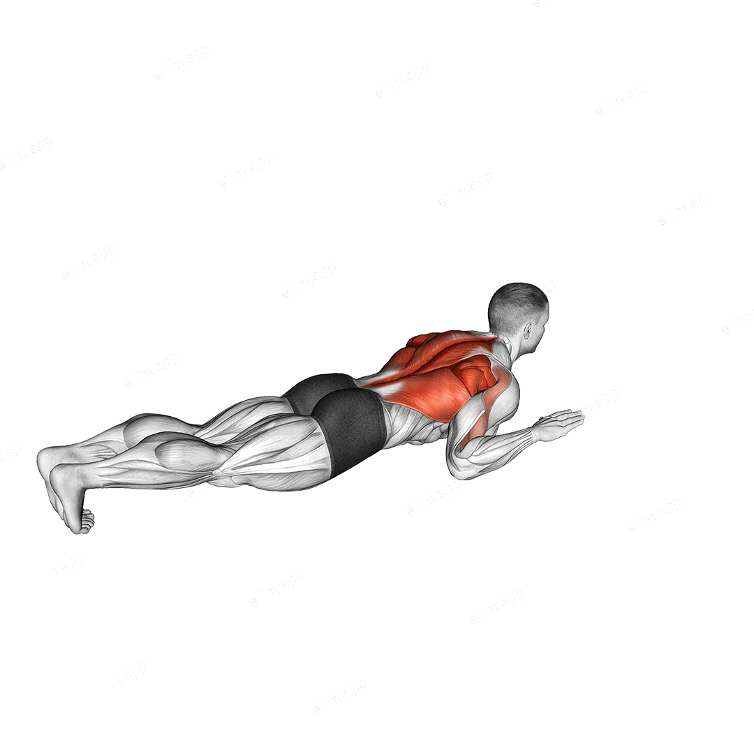 Lie face down on the floor with your body fully extended. Extend your arms straight overhead, palms facing each other, as if holding an imaginary bar.