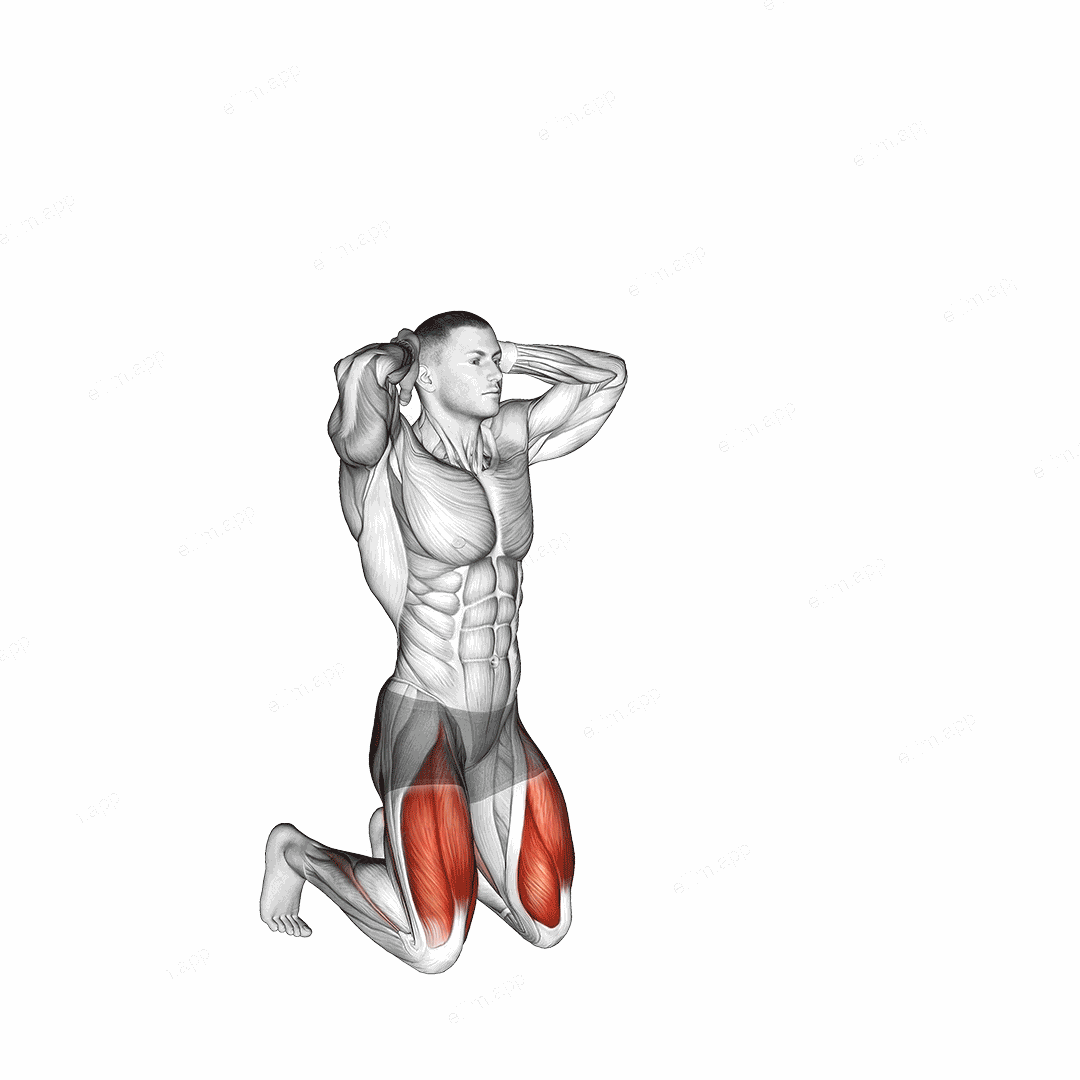 A full-body exercise that primarily targets the glutes, hamstrings, and core, with secondary emphasis on the shoulders and arms. The exercise begins in a kneeling position, moves to a half-kneeling position, and then fully standing, often with hands behind the head.