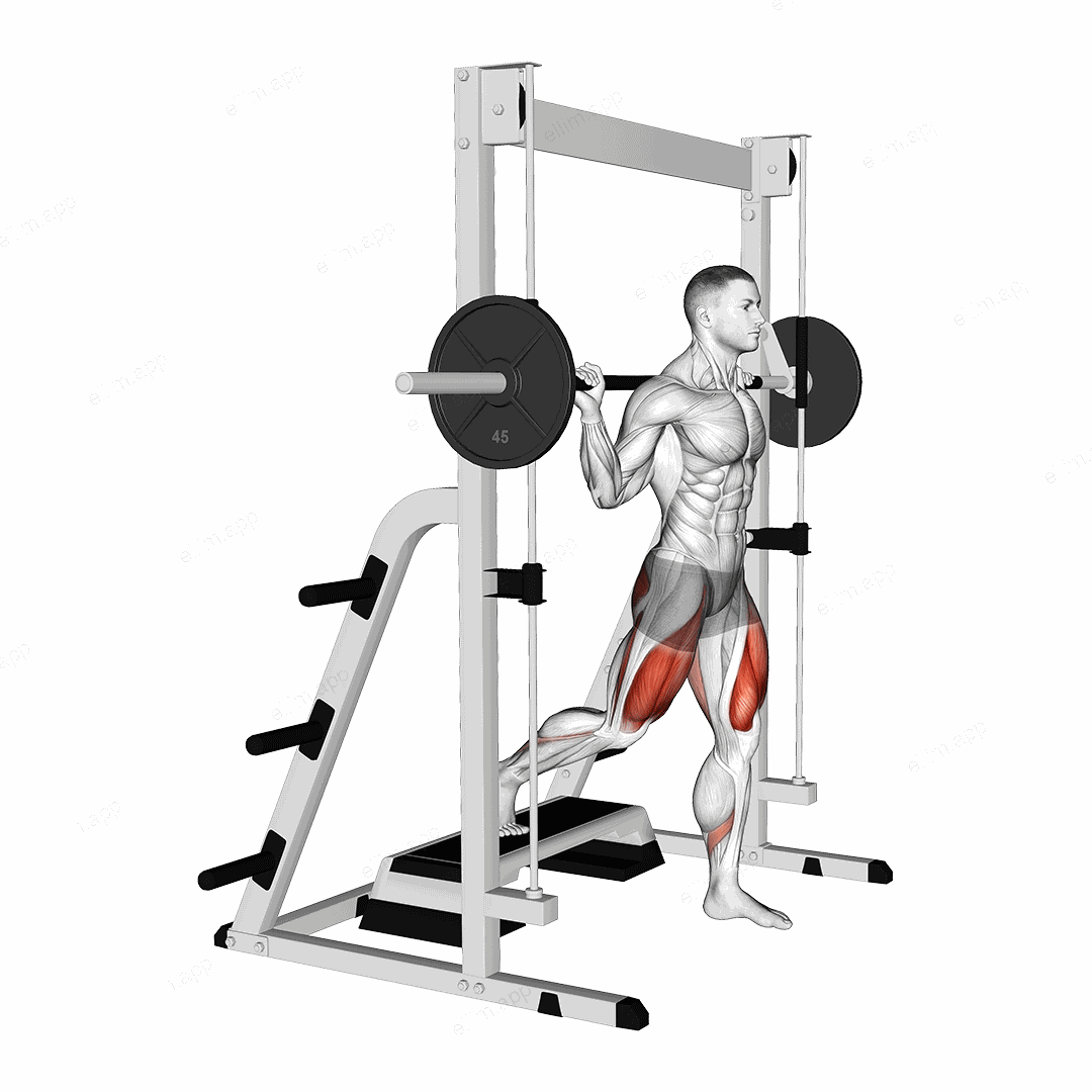 An effective strength exercise that targets the lower body, specifically the quads, glutes, and hamstrings. The exercise is performed on a Smith machine with one foot elevated behind.