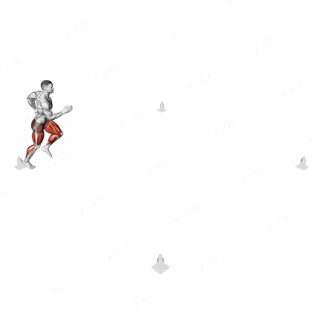 Sprint forward and diagonally to the top-right marker, touch it with your hand or foot, and immediately shuffle sideways back to the center point.